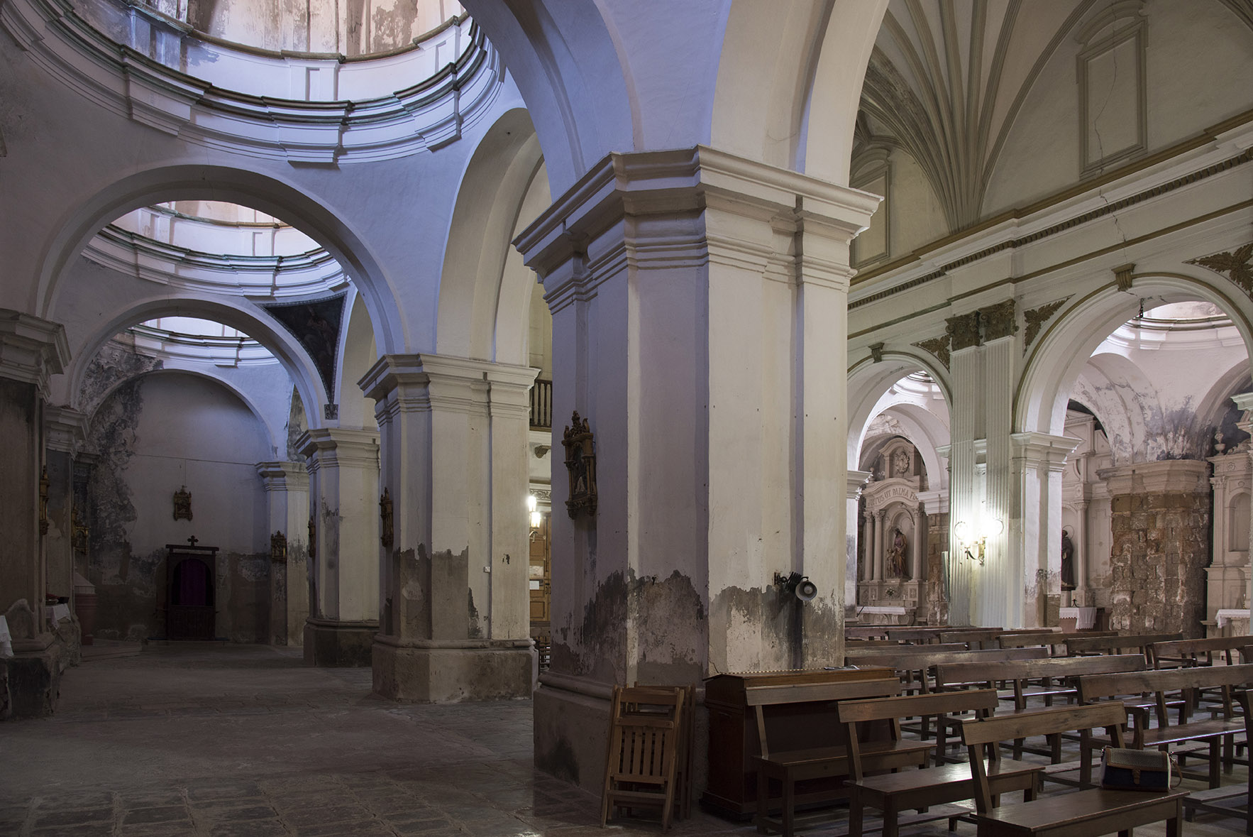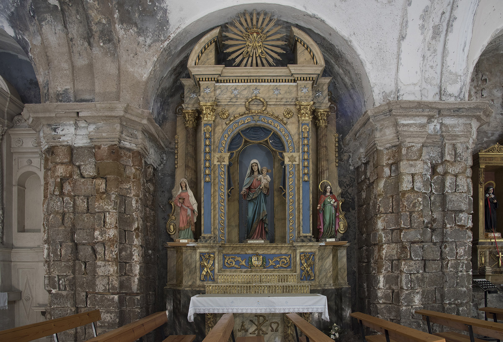 Todo el interior está enlucido, pero se ha perdido por completo debido a la humedad en los pilares del lateral izquierdo que dejan a la vista su fábrica de sillería.