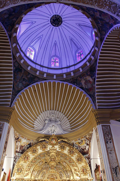 Exteriormente se advierte la estructura del templo con el escalonamiento de las naves y la cruz latina, de nave, crucero y presbiterio elevada sobre el resto, coronada a su vez por el cimborrio octogonal con un vano de medio punto en cada lado.