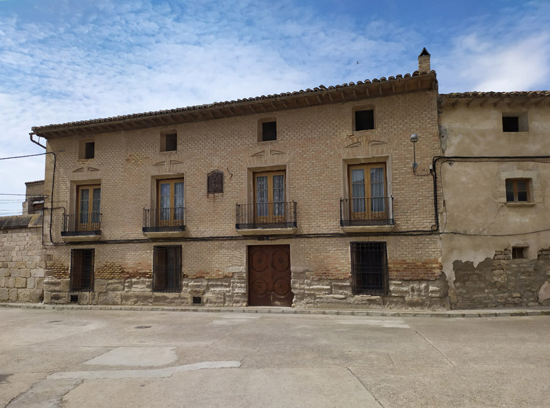 El escudo que marca el eje de la fachada está coronado por timbre de hidalguía y enmarcado por lambrequines vegetales. Es una pieza cuartelada que presenta en primer lugar un castillo, seguido por el árbol del Sobrarbe (en referencia al origen familiar en la localidad sobrarbesa de Santa María de Buil), a continuación, un buey y para terminar nuevamente una fortaleza.
