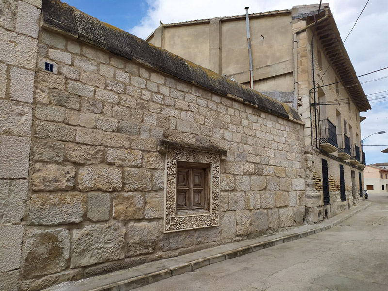 A la izquierda de la fachada encontramos una ampliación posterior en el que aparece un vano cuadrangular rematado en un dintel donde encontramos una profusa decoración de carácter vegetal, vides. Procede de la antigua bodega de la casa.