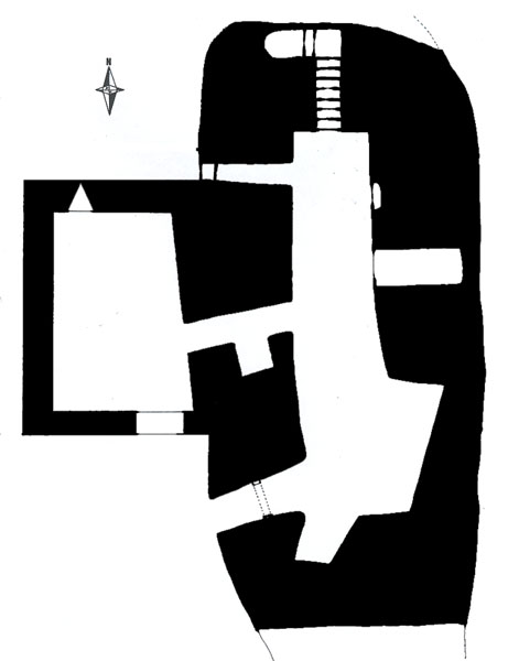 El cuerpo cuadrangular adosado pudo ser un torreón, actualmente desmochado a la altura de masa de arenisca. Está construido en sillería. En su muro sur se abre una puerta en arco de medio punto, de grandes dovelas. En su interior hay una estancia rectangular cubierta con bóveda de medio cañón. En sus muros se abren dos aspilleras rectangulares, muy derramadas hacia el interior, hacia donde presentan un vano adintelado sostenido por dos ménsulas convexas.