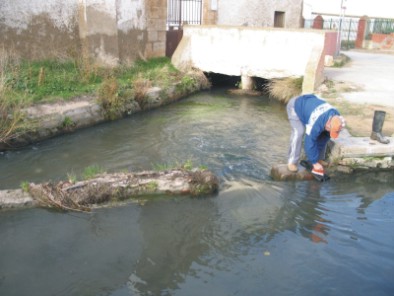 Toma el agua de un azud ubicado junto al camino del Poyo.