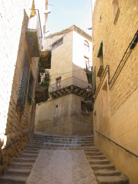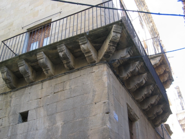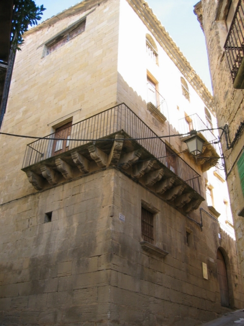 Magnífico edificio en esquina con las dos fachadas de sillería que tiene cuatro plantas. En la planta baja se abre la portada, con arco de medio punto de grandes dovelas fechado en 1767; sobre él, simétricamente situados en primera planta, aparecen dos ventanucos con alfeizar y con dibujo de forma conopial y un gran balcón corrido en esquina con vuelo de piedra sobre ménsulas decoradas, también de sillería. En la segunda planta, a ambos lados de la fachada se abren dos balcones con peana moldurada y entre ellos un balcón de gran vuelo con ménsulas. En el piso superior hay una galería aragonesa de tres arcos de medio punto, mayores que los habituales, con balaustrada interior de madera. La fachada lateral es un gran muro de sillería en el que se abren pocos huecos de ventana, predominando fuertemente el macizo, hecho éste que le otorga un bello efecto. Presenta una cornisa de piedra con molduras.