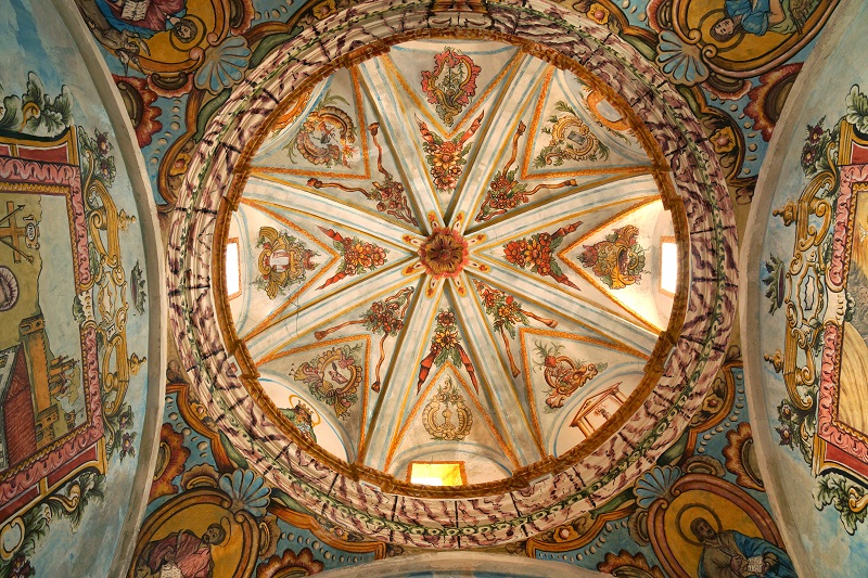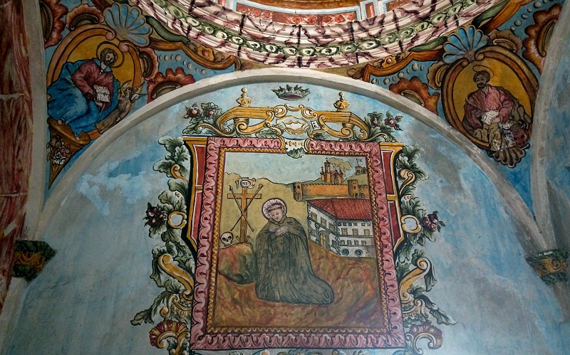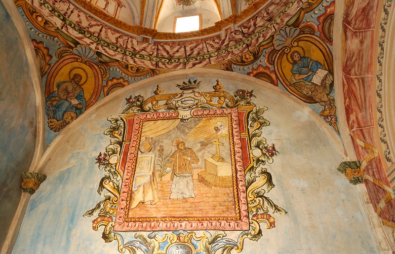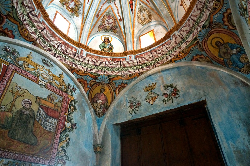 El elemento más llamativo del interior es la exuberante decoración pictórica, que cubre totalmente la cúpula y parte de los muros: hay pinturas ilusionistas de carácter arquitectónico, como las parejas de columnas y el arco escalonado que decoran el frente del altar; elementos decorativos característicos de las decoraciones populares en el barroco tardío, como rocallas y motivos vegetales; símbolos religiosos (cáliz, libro…) en los lunetos de la cúpula; y, por último, diversos motivos figurativos: pinturas de San Bernardo y San Felicísimo en dos de sus frentes, los cuatro evangelistas en las pechinas y una representación femenina que parece corresponder a la Virgen.