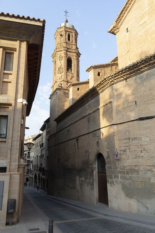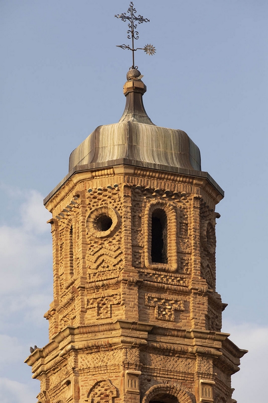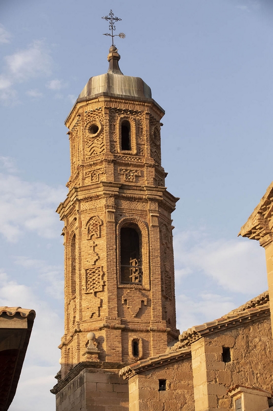 La torre está a los pies, en el lado de la epístola, con cuatro cuerpos de cantería y ladrillo, formando este diseños mudéjares.