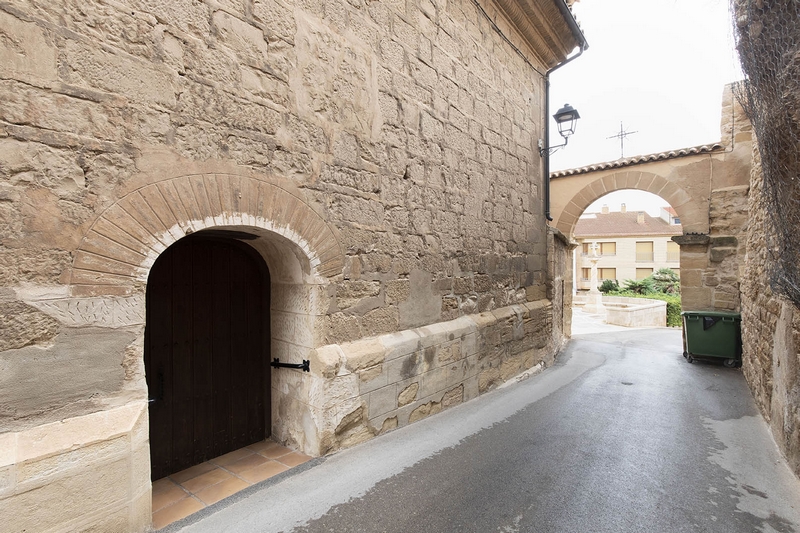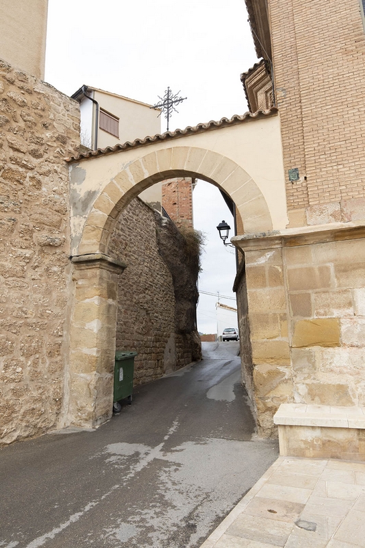 La fachada está flanqueada por dos arcos, bajo uno de los cuales discurre una calle; el otro está ocupado por la casa del capellán.