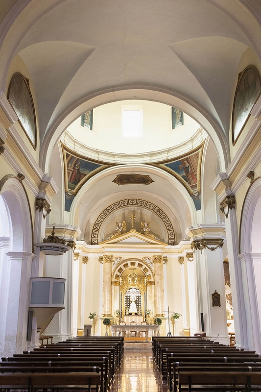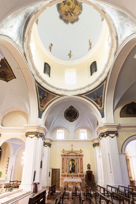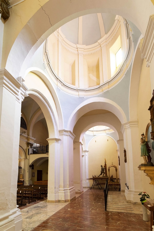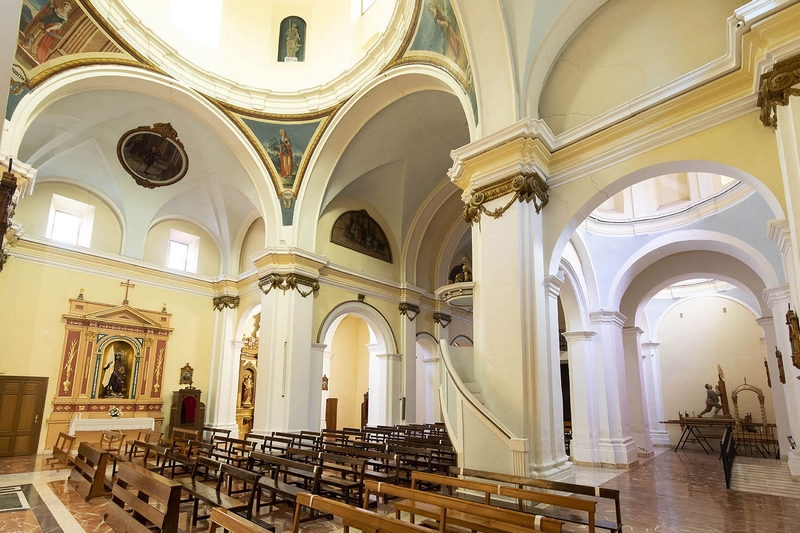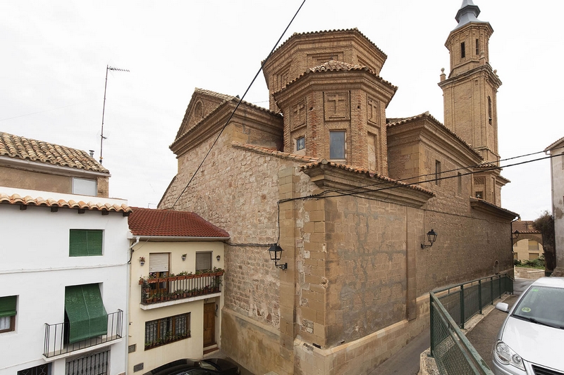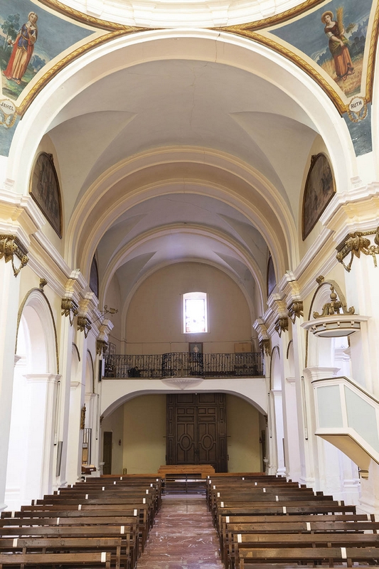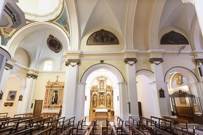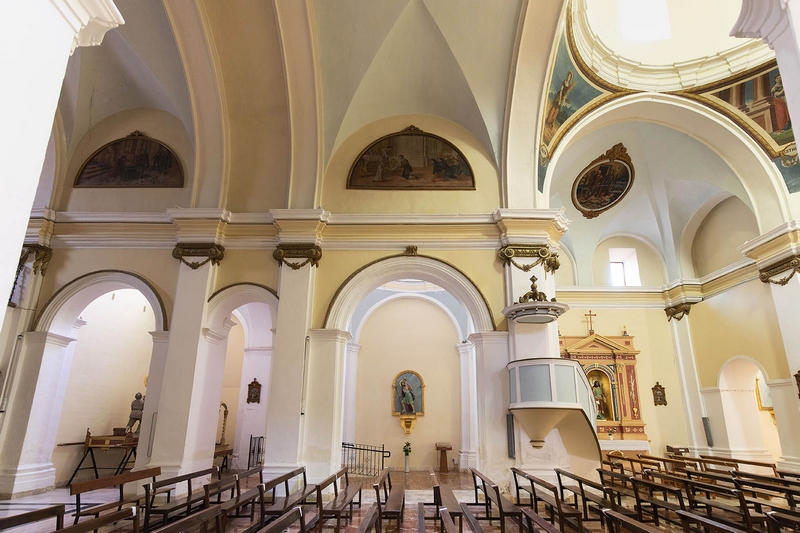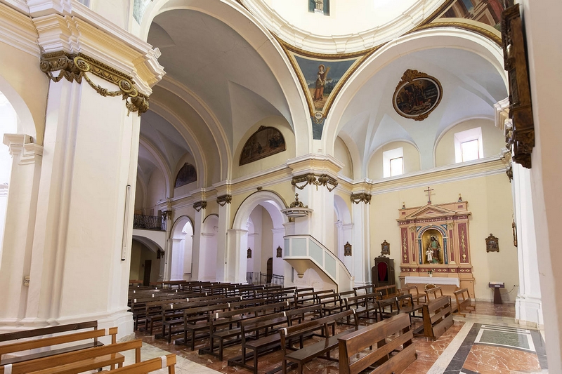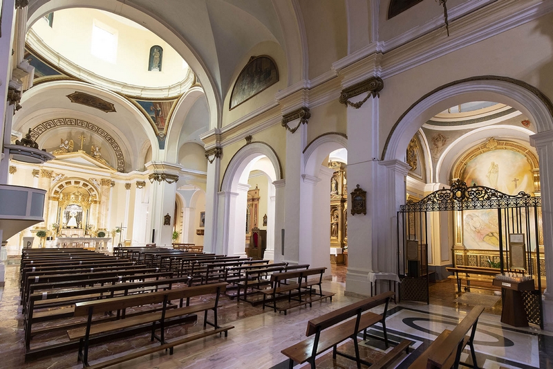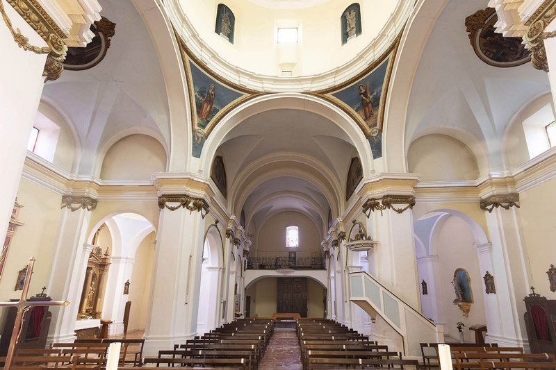 Tiene tres naves de tres tramos más crucero, cabecera plana y capillas laterales. La cubierta de la nave central es una bóveda de medio cañón con lunetos, mientras que en las laterales aparecen cúpulas, al igual que en el crucero. Esta cúpula descansa en pechinas con pinturas de Esther, Judit, Jael y Ruth. Los brazos del crucero se decoran con medallones alusivos al famoso milagro de Pellicer.