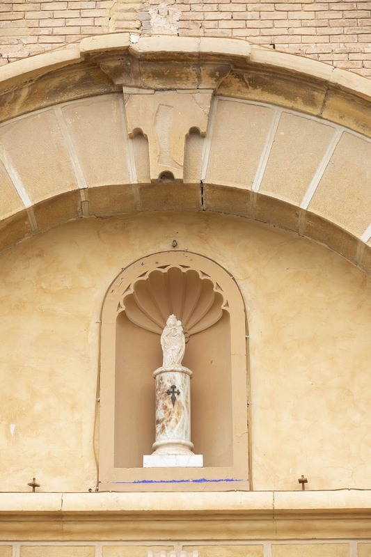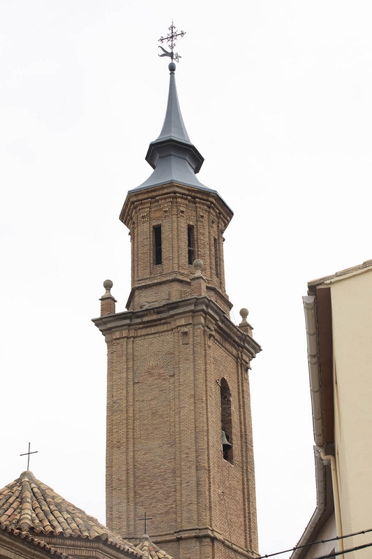 A los pies, en el lado del evangelio, se sitúa la torre que tiene tres cuerpos de ladrillo.