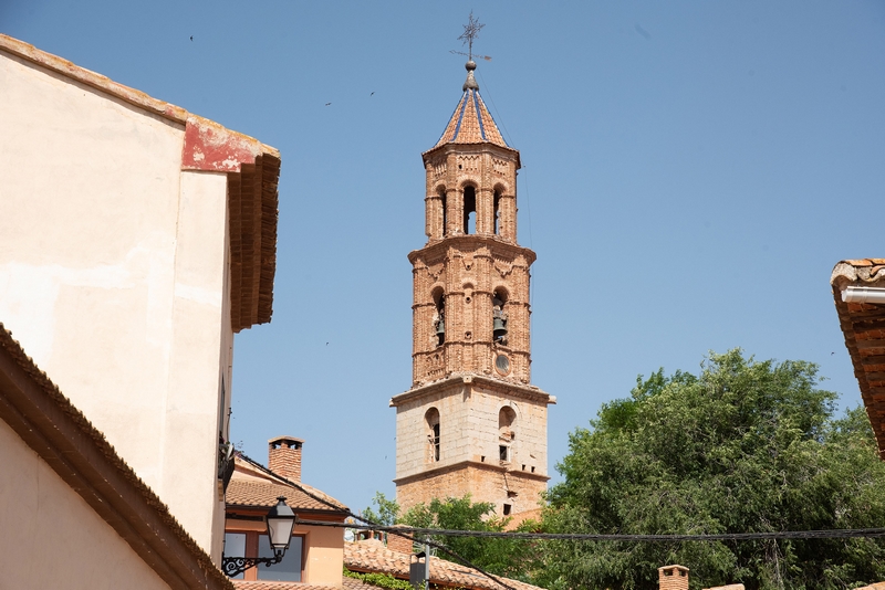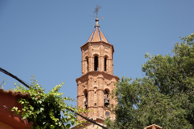 La torre-campanario se encuentra a los pies, adosada en la mitad, con cuatro cuerpos. Los dos primeros son de mampostería y planta cuadrada; los dos últimos de ladrillo y de planta octogonal, de estilo barroco.