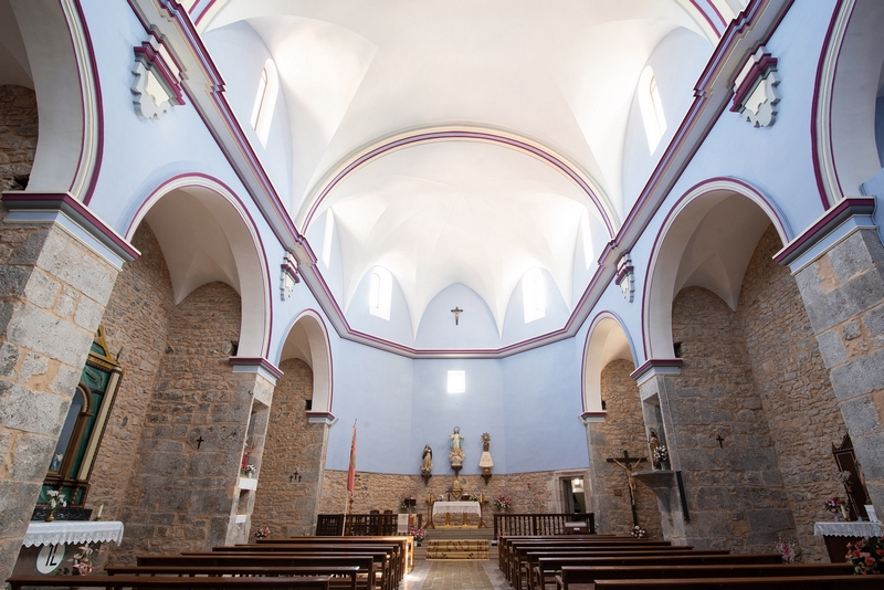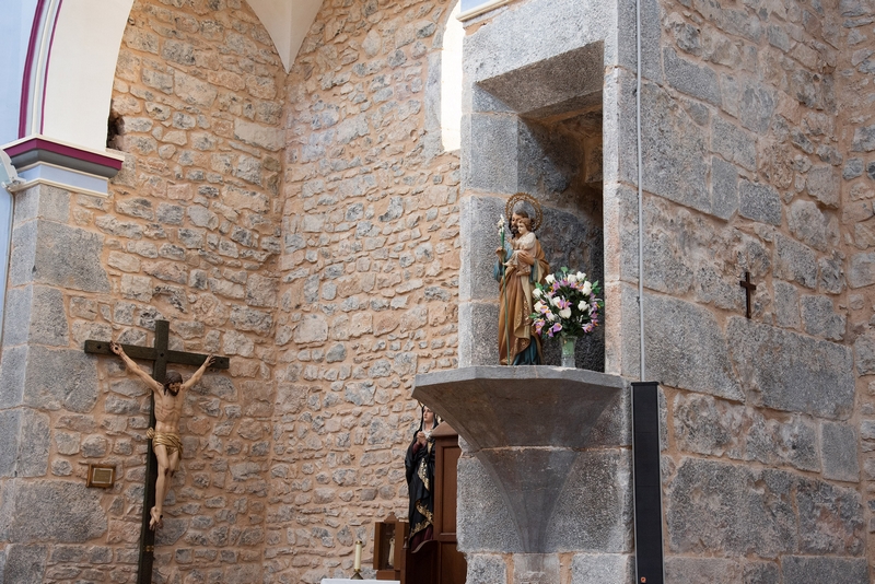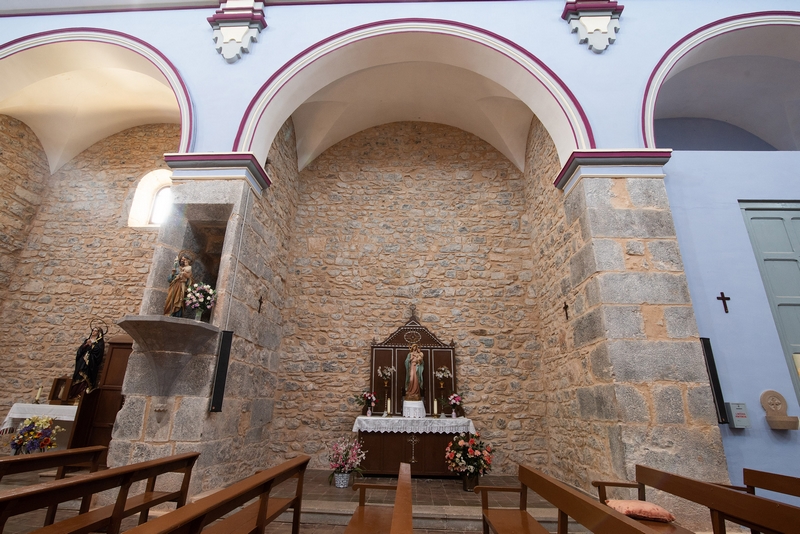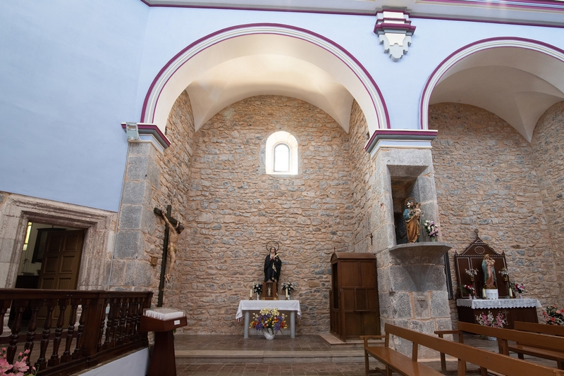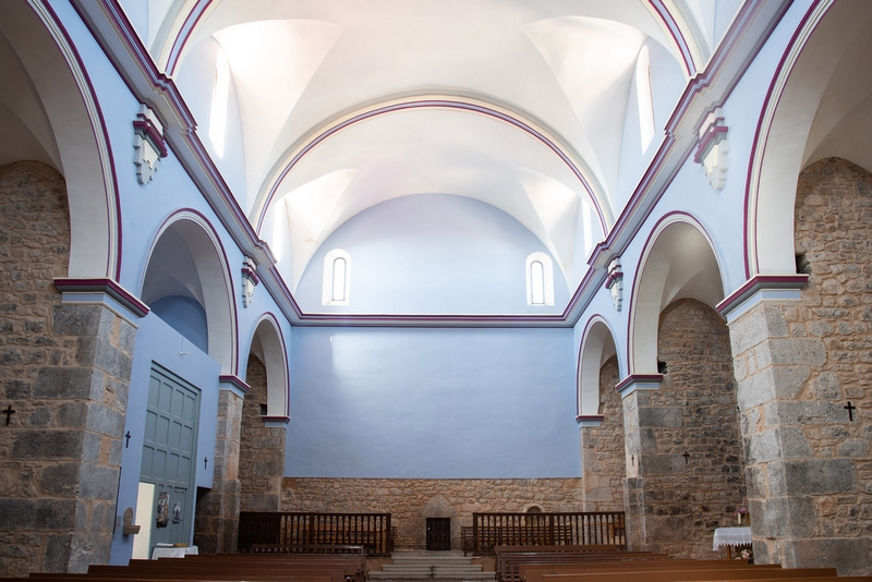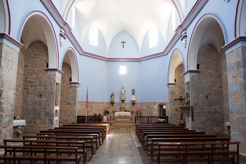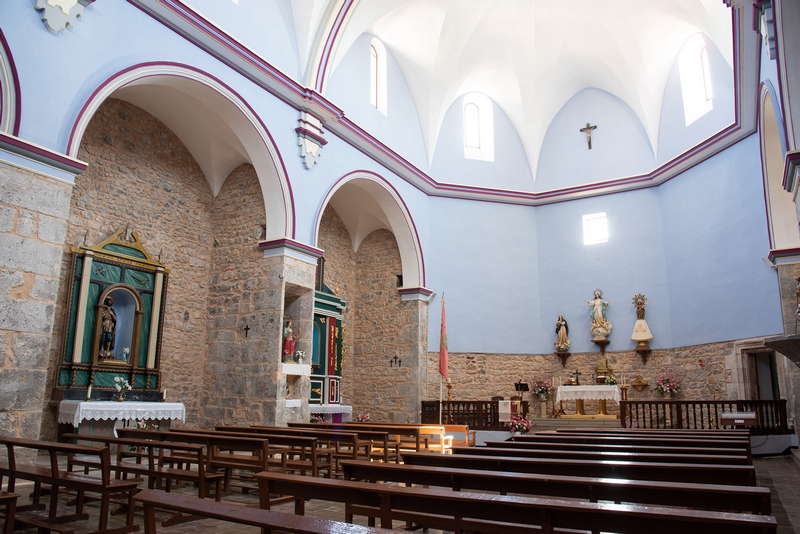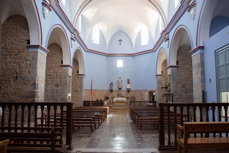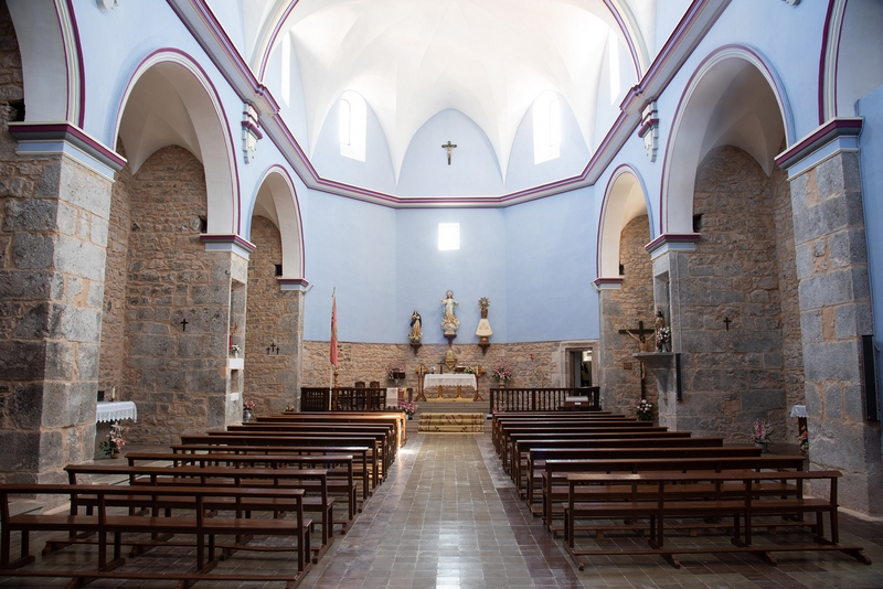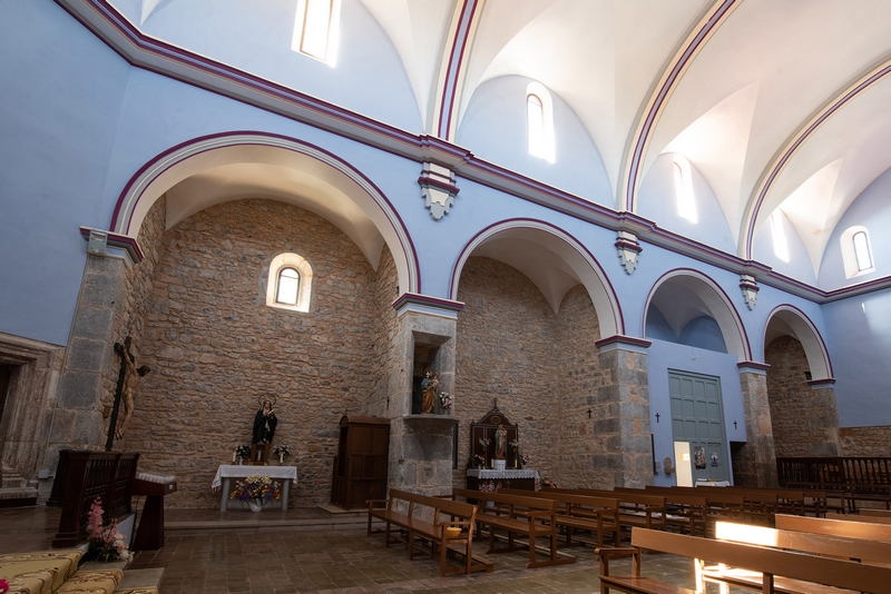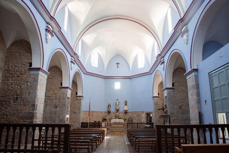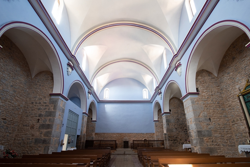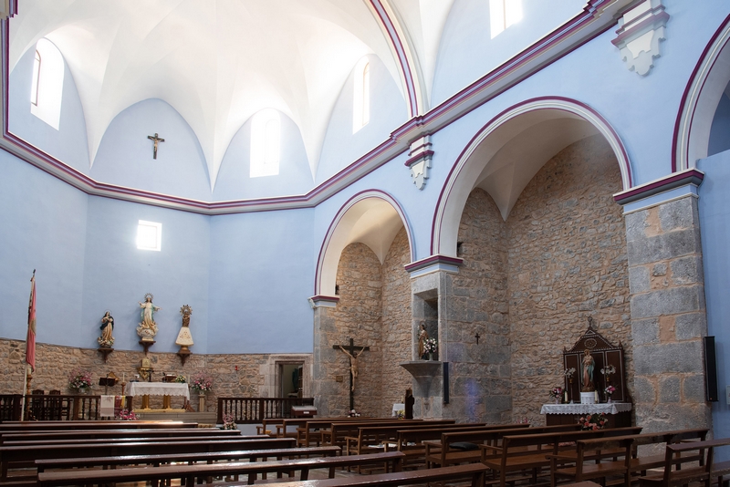 El interior tiene una sola nave de tres tramos, cubierta con bóveda de medio cañón con lunetos, fruto de la reconstrucción llevada a cabo tras la Guerra Civil. La cabecera conserva la bóveda de crucería estrellada, que sería el cubrimiento original del templo.