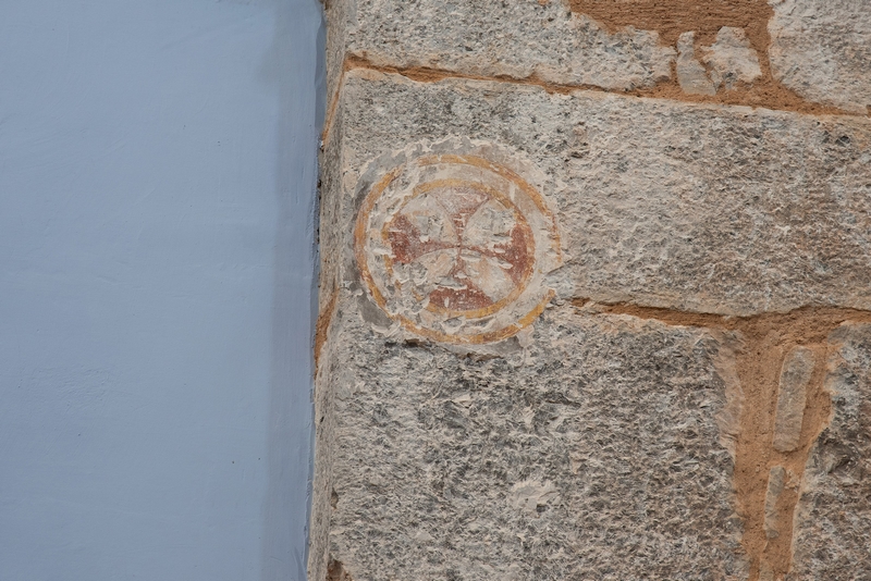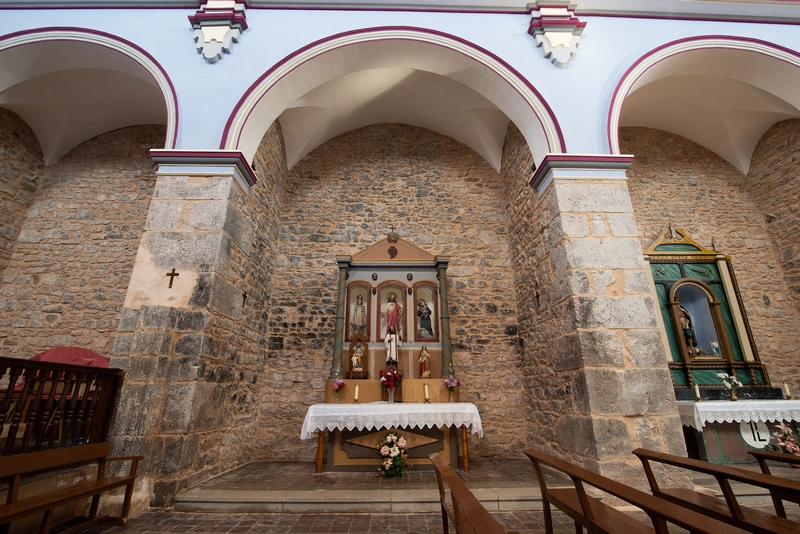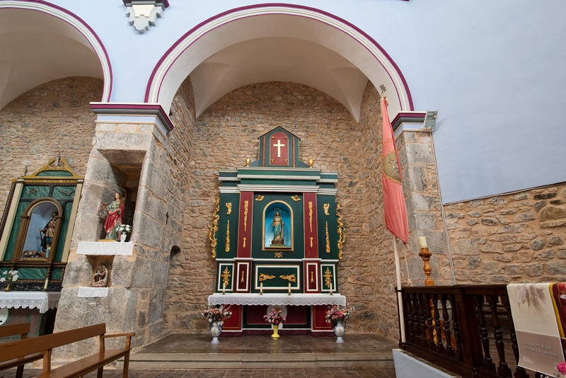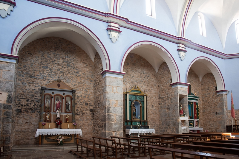 Los muros presentan el sillar desnudo hasta el arranque de las bóvedas, las cuales están enfoscadas con estuco. Presenta escasa decoración, exceptuando algunas molduras de yeso.