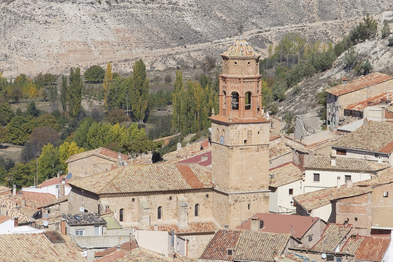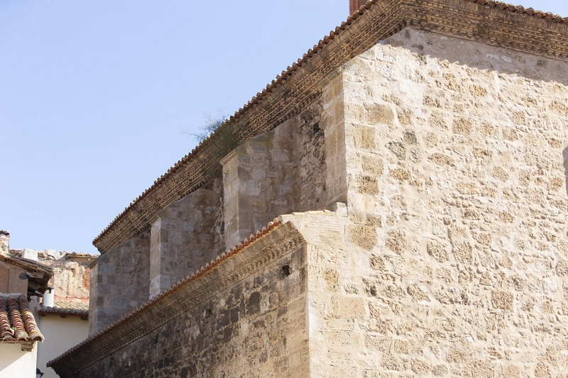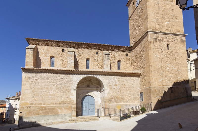El edificio cuenta con una nave en la que se abren capillas laterales de menor altura, haciéndose visible esa diferencia de volúmenes al exterior. En la parte superior de la nave, se pueden ver pequeños vanos cerrados con vidrieras, así como los contrafuertes que soportan parte de la estructura. Destaca la decoración de las cornisas de los aleros, realizada con frisos de ladrillo que forman distintos motivos geométricos, de clara influencia mudéjar, semejantes a las de Fuensanta de Villel.