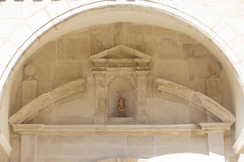 La portada sigue un esquema de corte renacentísta, clásico y con gran limpieza de líneas. La entrada se encuentra dentro de un pórtico de arco de medio punto y bóveda de cañón. Sobre la puerta, flanqueada por pilastras adosadas decoradas con acanaladuras, se dispone un tímpano semicircular partido, y en su centro se abre una hornacina, rematada por un frontón rectangular, donde se encuentra una imagen de bulto del santo.