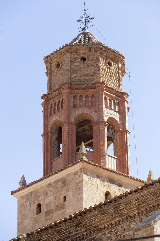 En la parte delantera de esta fachada principal se levanta la torre-campanario. Tiene tres cuerpos: el primero es de planta cuadrada, y en su interior se encuentra la sacristía; los dos siguientes son octogonales y están hechos en ladrillo con cierta impronta mudéjar; el segundo es el cuerpo de campanas.