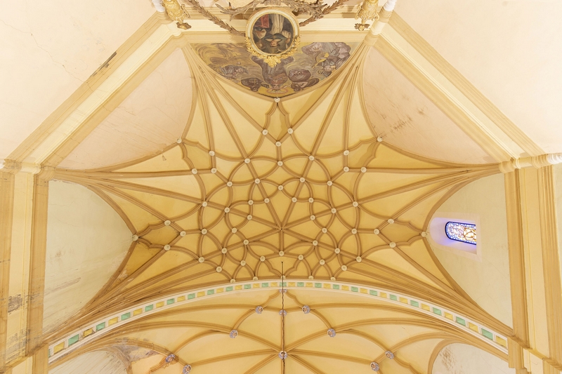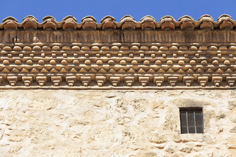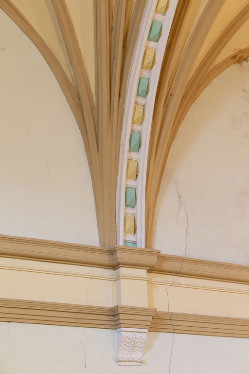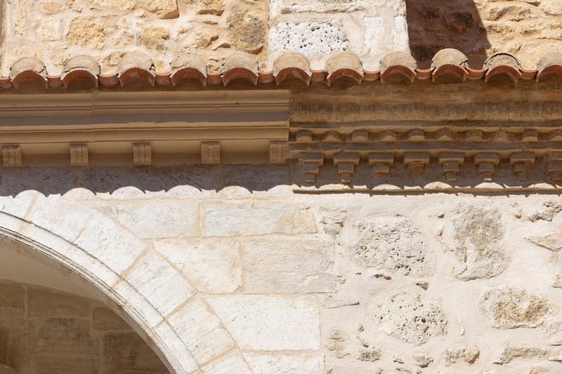 Los muros se encuentran enfoscados y sin decoración, salvo la línea de imposta realizada con una sencilla moldura.