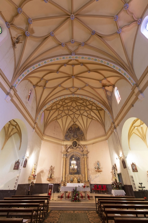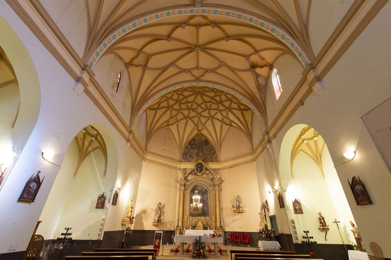 El interior de la iglesia está articulado por una nave separada en tres tramos, separados por arcos fajones rebajados que apean en ménsulas voladas. La nave se cubre con bóvedas de crucería estrellada, siendo la que cubre la cabecera una de las más importantes de la provincia, relacionada con la de Cubla.