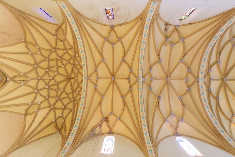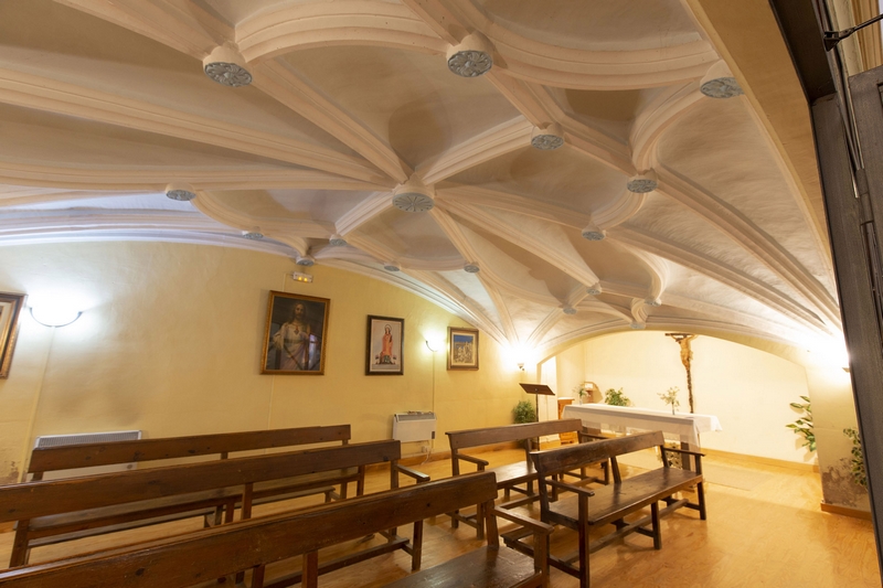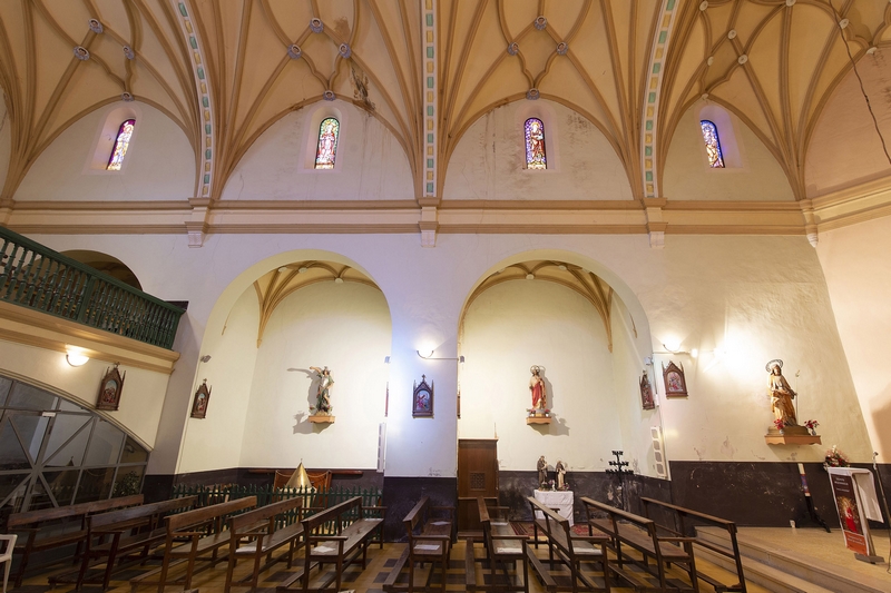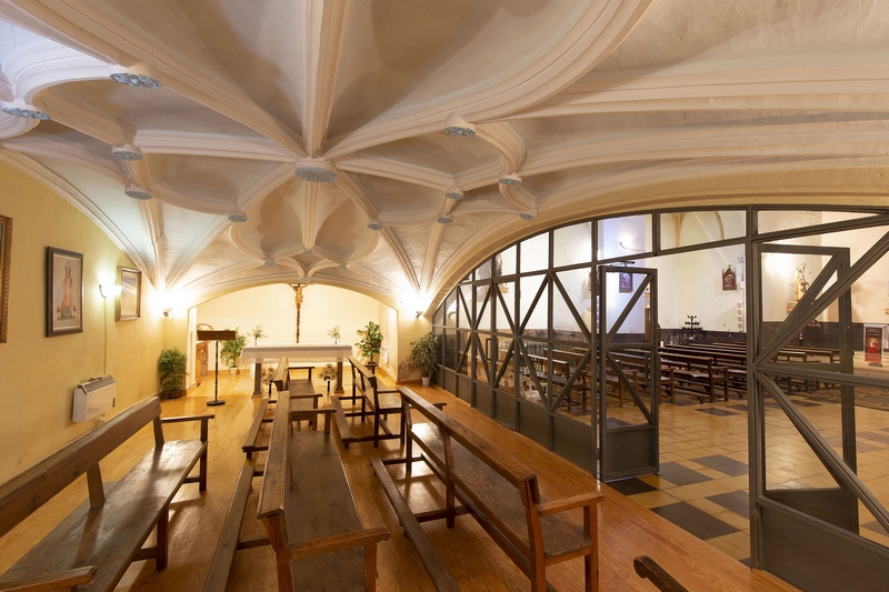 Las capillas laterales se abren entre los contrafuertes, con embocadura en arco de medio punto, escasa profundidad y cubiertas con bóvedas similares.
