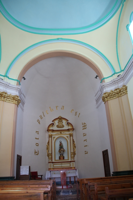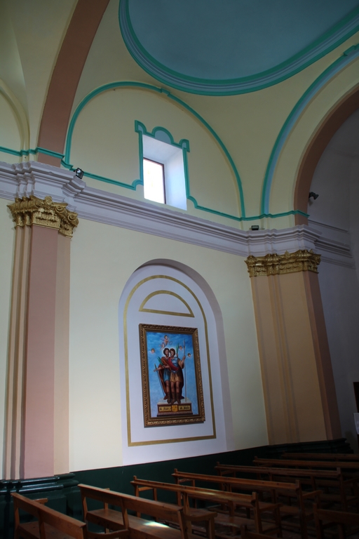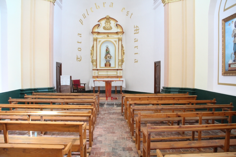 El acceso se realiza mediante un atrio de planta cuadrada y tres arcos de medio punto, con moldura continua a la altura del dintel. Al interior, cuenta con un ábside cubierta con bóveda de medio cuarto, y una nave única cubierta con una cúpula rebajada sobre pechinas. Como es propio del estilo barroco, los muros están decorados con pilastras con capiteles vegetales y líneas de imposta con molduras rectas.