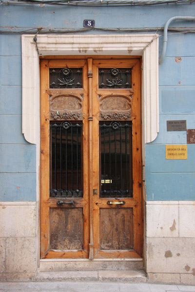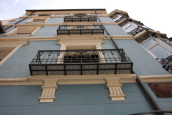 Las fachadas presentan un tratamiento unitario enfoscado en color azul ultramar combinado con detalles ornamentales en blanco. La composición sigue un esquema tradicional estructurado mediante impostas horizontales a la altura de los forjados, entre las que se disponen los balcones y ventanas de forma proporcionada y homogénea. Las dos esquinas se resuelven mediante chaflanes en los que sobresalen unos espectaculares miradores volados realizados en forja.