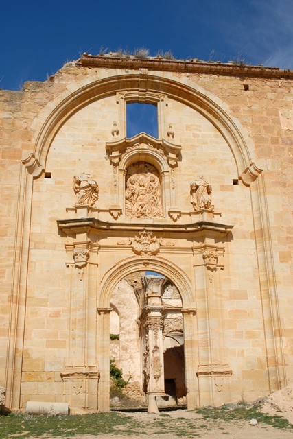 Dado el estado de ruina total del edificio, destaca especialmente la fachada, situada a los pies de las naves, que todavía se mantiene relativamente íntegra. Es una obra de sillería, enmarcada por un gran arco de medio punto con moldura de bocel a la altura de las impostas. Bajo el arco se encuentra la portada propiamente dicha, dividida en dos cuerpos. En el inferior, el arco de medio punto está flanqueado por pilastras en esviaje. Sobre él, se sitúa el entablamento, de base muy movida con una hornacina y un grupo escultórico que representa la Piedad. Como remate, hay un frontón quebrado.