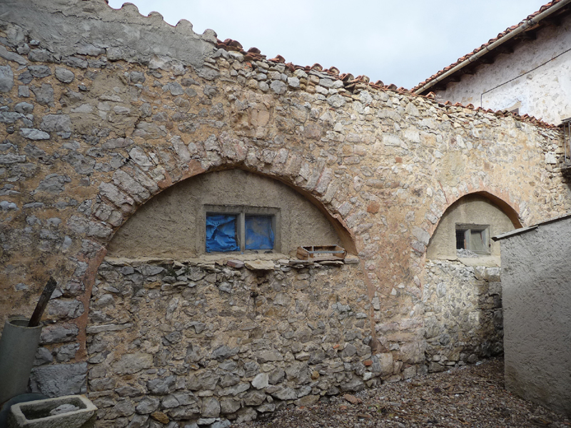 Las paredes son de mampostería revocada o enfoscada con lo que parece un mortero de cal, y encaladas. El almacén anexo presenta amplios arcos de medio punto cegados en una de sus paredes laterales.