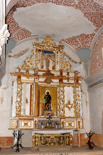 Al interior, la nave está dividida en dos tramos por un arco perpiaño y cubierta con bóveda de medio cañón con lunetos, decorada con esgrafiados.