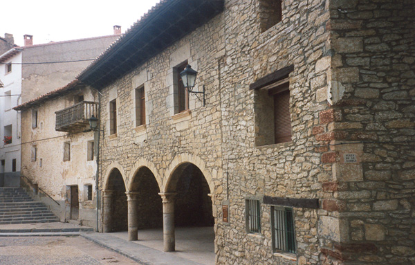 El ayuntamiento de Villarroya de los Pinares presenta el característico sistema compositivo de edificio consistorial el siglo XVI, comparable por ejemplo al ayuntamiento de Mirambel.