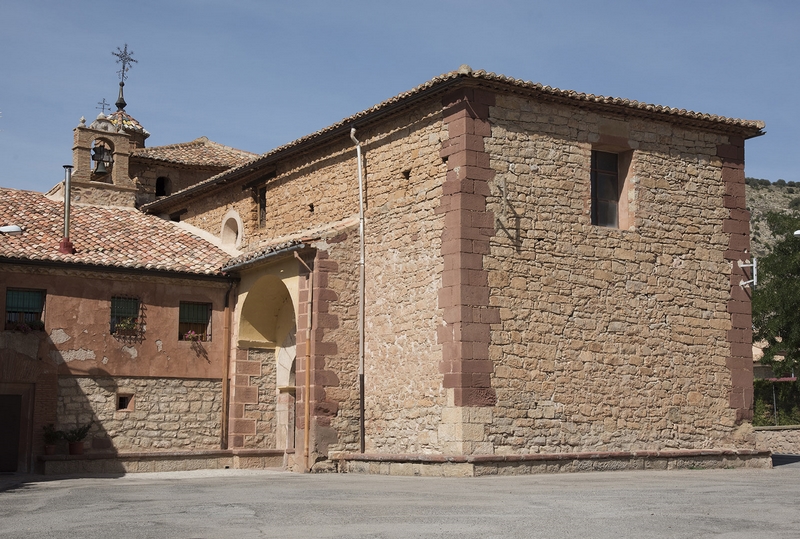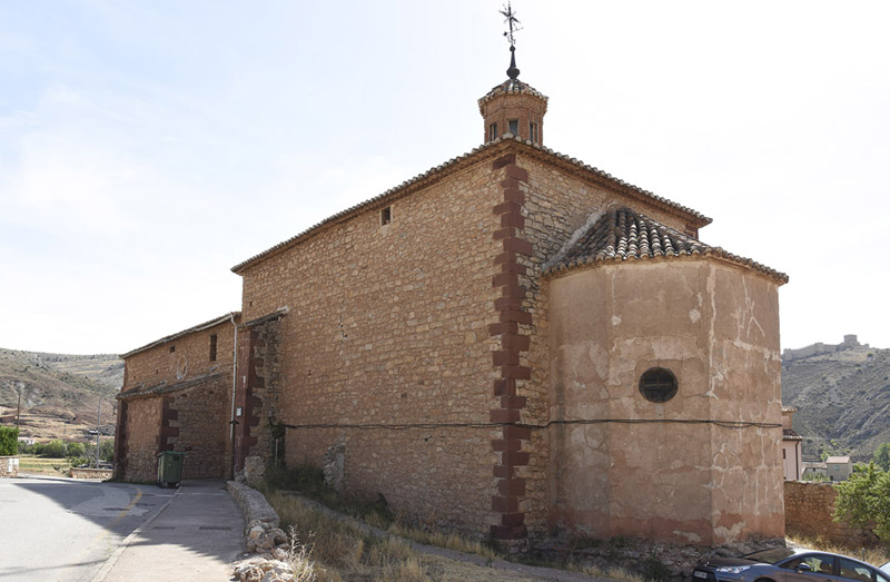 En el exterior es un conjunto de mampostería y sillares de ródeno en las esquinas, con portada cobijada bajo arco de medio punto. Destaca la linterna octogonal de ladrillo.