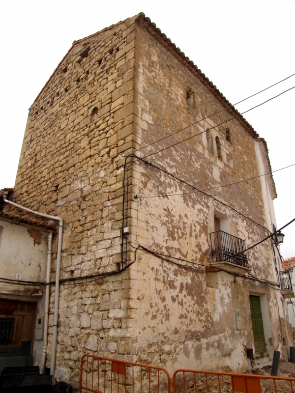 Entre la primera y la segunda planta se observa un patente cambio en las dimensiones de los sillares, más grandes y menos desgastados en las plantas superiores que en las inferiores, aunque no se aprecia con claridad una junta de obra que indique que nos encontramos ante dos fases constructivas distintas o ante una reparación. De los vanos que actualmente perforan la fachada principal, solo son originales con seguridad la pareja de ventanas geminadas, cubiertas con arcos ligeramente apuntados tallados en un mismo bloque y con un parteluz sencillo; estas ventanas, rodeadas de un paño de sillería de mejor calidad, se sitúan en lo que ahora es la segunda planta, perfectamente centradas en la fachada, al igual que el balcón de la primera planta, sin que se pueda descartar la posibilidad de que este último enmascare un vano original muy transformado.
