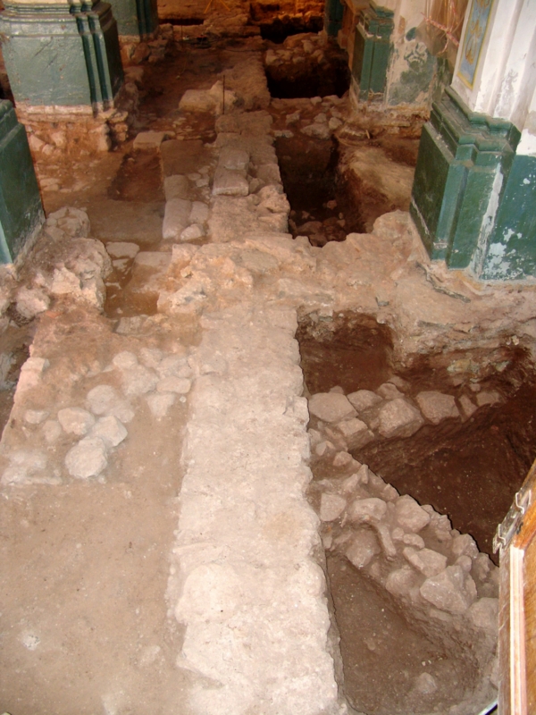 Tras atravesar un pequeño atrio subierto con bóveda de lunetos, se accede al interior, que consta de tres naves, la central más ancha que las laterales, separadas por grandes pilares cruciformes; crucero no acusado en planta y, prolongando la nave central presbiterio y ábside semicircular.