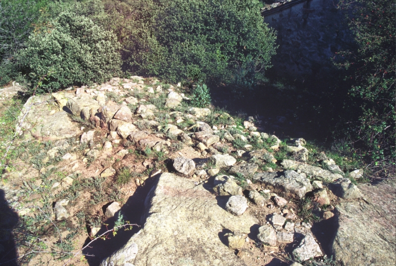 La masía y los restos de muros anteriores a la construcción actual se encuentran cerca del punto más alto del espolón. La cerámica medieval apareció en el barranco que delimita el espolón por el NE.