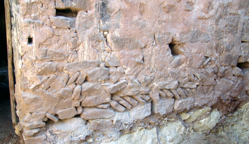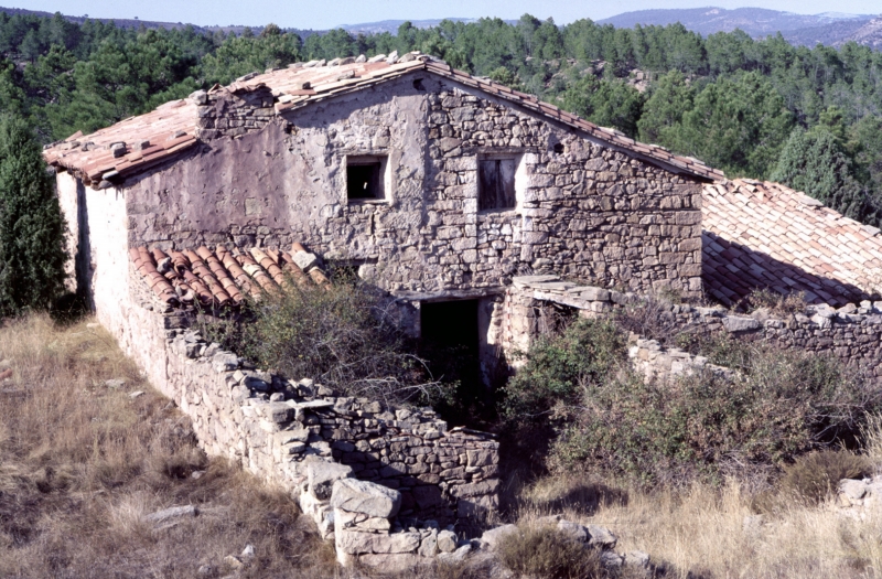 - Masía: es un edificio resultante de varias fases constructivas y agregación de múltiples bloques. En origen debía ser una construcción a una sola vertiente, realizada con mampostería trabada con mortero de yeso ¿y de cal?, con sillares en las esquinas. Como elemento destacado el uso de mampuestos dispuestos oblicuamente (opus spicatum), presente en edificios del siglo XIII de las sierras de Gúdar, Javalambre y Maestrazgo, si bien los materiales más antiguos detectados en la masía datan del último cuarto del siglo XIV.