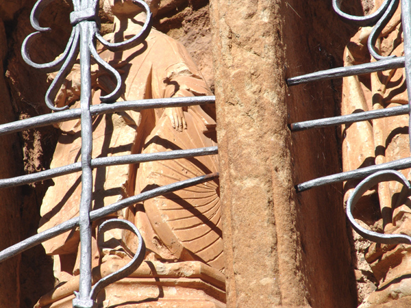 Las dos figuras asientan sobre peanas poligonales molduradas y un dado de piedra que les permite ganar altura, evidenciando que no estaban previstas para este emplazamiento.