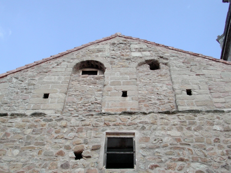 Al exterior se conserva la antigua espadaña, realizada con sillería, que presenta dos arcos de medio punto actualmente cegados, pero que conservan los puntos de anclaje de las primitivas campanas. En el espacio entre bóvedas se aprecia la existencia de huellas de un incendio que afectó a la espadaña en un momento anterior a la construcción de la anterior cubierta.