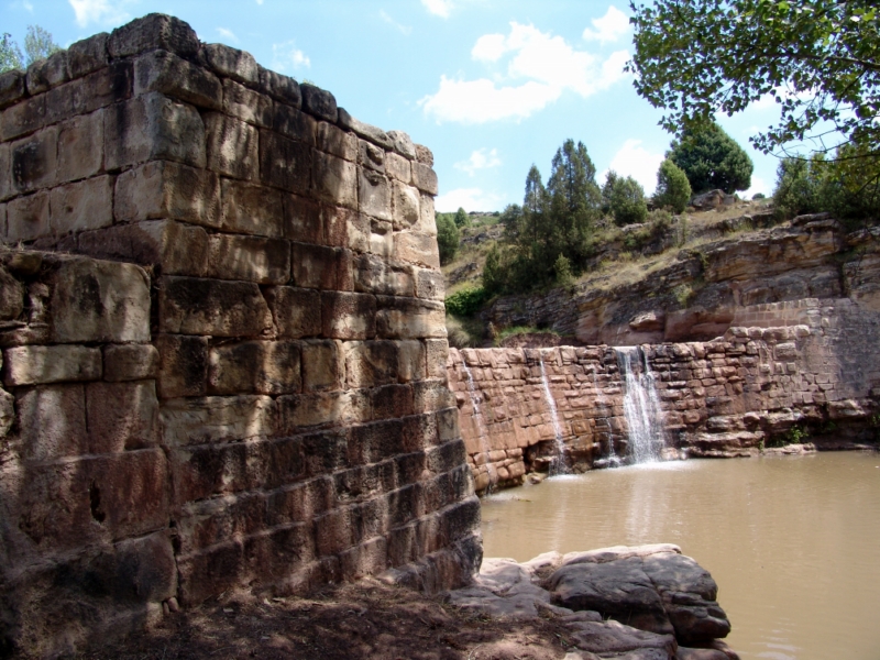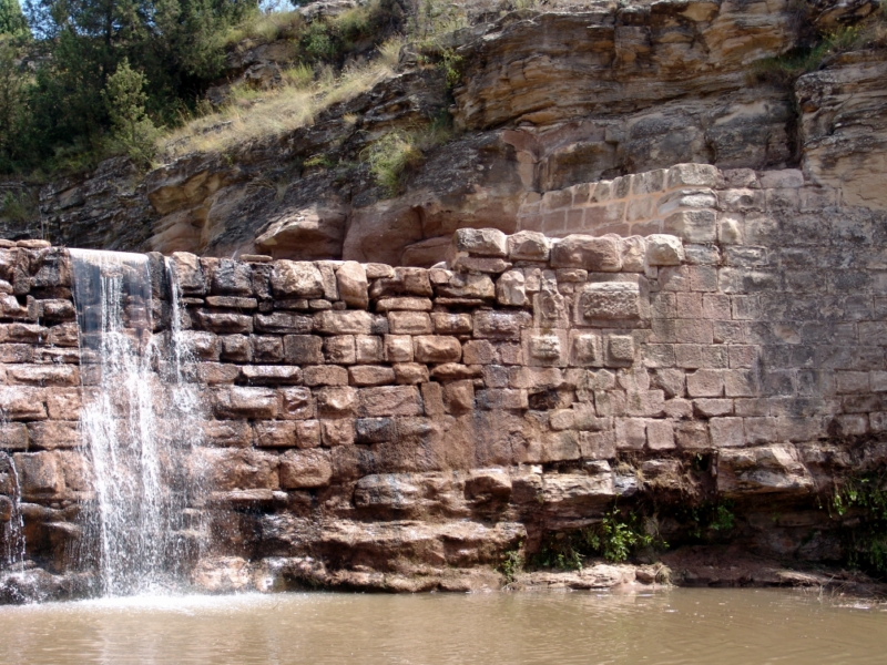 * Potente estructura de sillería arenisca de traza gótica, adosada al afloramiento de cantera que sobresale por encima del cauce en la margen izquierda del río. Esta estructura sirve para "fijar", el extremo de la presa a dicho afloramiento rocoso.