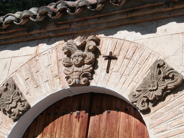 Rafe de ladrillo, creando un "friso". En la clave, de mayor tamaño, relieve de la virgen de Arcos, flanqueada por un ángel esculpido en la dovela a su izquierda y san Miguel en la dovela derecha. Sobre ella una corona.