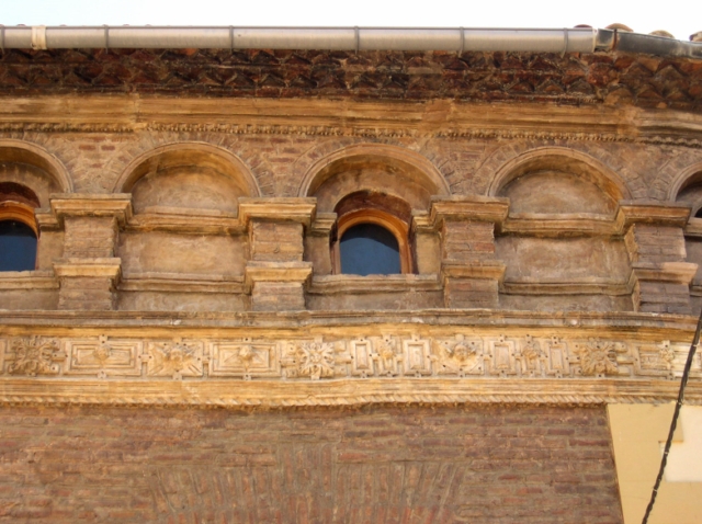 En el piso superior hay una galería de arcos de medio punto de doble rosca apoyados sobre un friso decorado con motivos clásicos (vegetales, geométricos y cabezas humanas), alguno de ellos cegado. En el extremo occidental, esta galería se prolonga mediante tres arcos escarzanos sobre columnas estriadas. Además, un gran alero volado unifica toda la fachada que presenta un quiebro en forma convexa y tiene una importante presencia en la plaza en la que se sitúa. Este quiebro supone la partición en dos de la casa original. La casa adosada a su derecha conserva la galería de arcos de medio punto, el friso decorado bajo él y el rafe de ladrillo, pero presenta totalmente renovada su planta baja y el primer piso al ser revocado y decorado al gusto neoclásico.