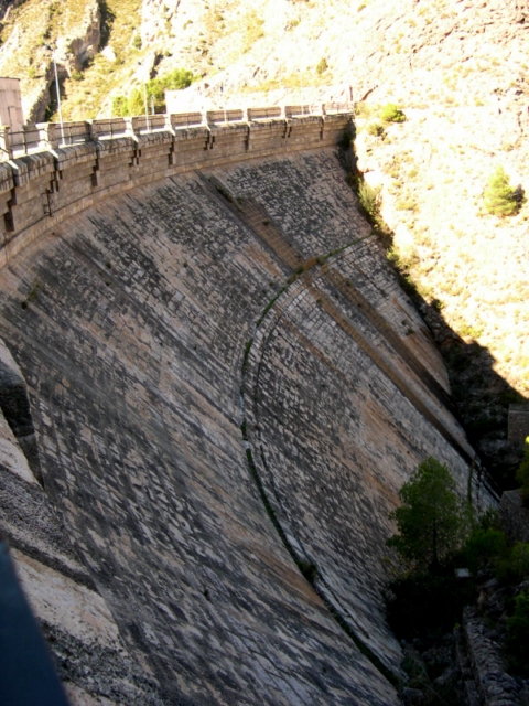 Presa compuesta con su correspondiente aliviadero y dos casas de máquinas (una de ellas, de piedra y de considerables proporciones). Tiene 112,60 m. de longitud de coronación, es de tipología de gravedad. Presenta un aliviadero de 1 vano de 110 m, y 1 desagüe de fondo. Su altura sobre los cimientos es de 65 m. Es de destacar el trabajo de la piedra, así como el cuidado en sus detalles, como en la casa de máquinas, así como las proporciones del aliviadero. El sistema de compuertas original se conserva en una sala en la zona inferior de la presa, en una sala de ladrillo a la que se accede a través de un pasillo abovedado. Conserva alguna maquinaria como unas poleas en sus extremos, que quizás se utilizaron durante la construcción de la presa.
