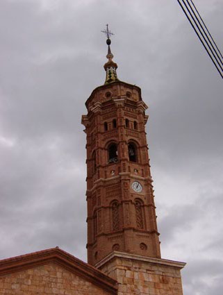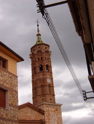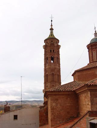 La torre, situada a los pies en el lado de la epístola, es uno de los más importantes ejemplos de arte mudéjar tardío del valle del Jiloca turolense. Tiene cinco cuerpos, el inferior de cantería rectangular y los restantes de ladrillo de forma octogonal con envolvente elíptica: esto es, sus dos ejes transversales son de distinta dimensión al levantarse sobre un cuerpo de torre de planta rectangular. Las pilastras de esquina refuerzan la composición, con óculos y vanos de medio punto en los distintos cuerpos y diseños mudéjares en los paños ciegos -rombos o lacerías que se mezclan con otros, como arquillos o cruces. El historiador Gonzalo Borrás destaca la calidad de su ornamentación: "Técnicamente se maneja el ladrillo resaltado con enorme vigor y dentro de la mejor tradición de escuela de Calatayud".
