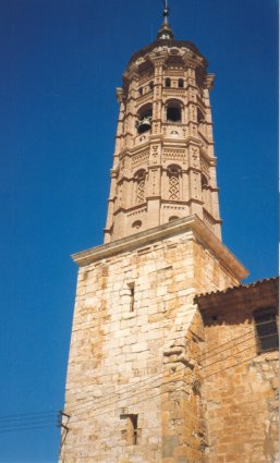 El origen de una parte del actual templo tal vez haya que situarlo en un documento de 1409, descubierto por Isaac Bureta Anento. En este documento se menciona a Pascual de Exulve quien recibe unas cantidades de dinero por haber construido dos capillas, dos pilares y un arco. La capitulación se había hecho en 1403, época del Papa Luna. En un lateral de la clave del primer cuerpo de la torre figura su escudo por lo que cabe suponer que pudo contar con su mecenazgo, aunque es un extremo a confirmar. En cualquier caso sirve para fechar a principios del siglo XV esa parte del templo.