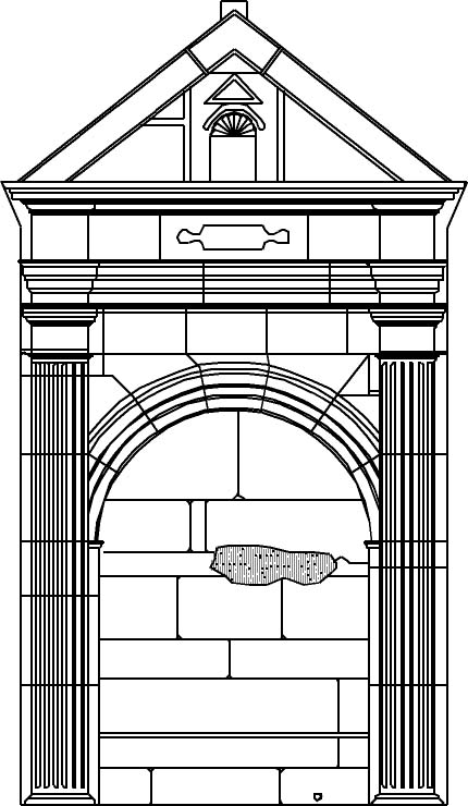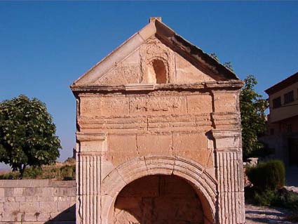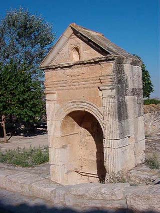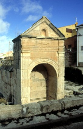 Presenta forma de templete clásico, con dos pilastras acanaladas con sus correspondientes basas, fustes acanalados y capiteles dóricos, sobre los que se dispone un arquitrabe con tres fasciae. Sobre este se dispone un friso corrido con una cartela, en su centro, como único motivo decorativo. Se remata con un frontón triangular cuyo tímpano se decora con una hornacina avenerada rematada con un frontón triangular nuevamente. Entre las pilastras se dispone un arco de medio punto, apoyado en una línea de imposta, cuyas dovelas repiten el motivo decorativo del arquitrabe y que cobija los dos caños, situados en la parte baja del frente y para lo que se dispuso una barra de hierro a modo de apoyo, y el vaso de la fuente.