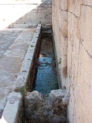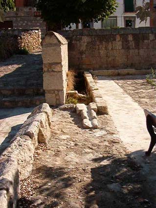 El abrevadero está dispuesto bajo un muro de sillería con remate triangular, a modo de cornisa, en el lado izquierdo de la fuente, y con planta en L, está construido en piezas de sillería con unión de grapas de cuña, actualmente no muy apreciables por el rejunte de los sillares con cemento.