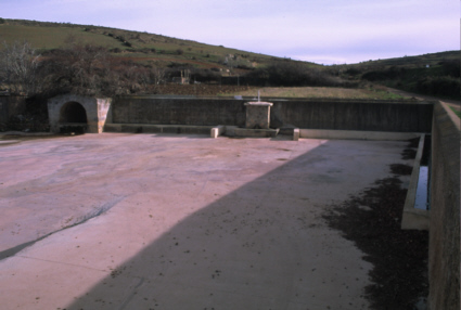 En el centro del espacio hay otra fuente cuadrangular adosada al muro. Esta tiene tres caños zoomorfos que dan a tres vasos paralepípedicos realizados en cemento endurecido.