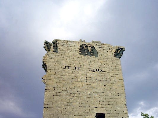 La torre del lado oriental es de planta cuadrada, de unos 6 metros de lado y está mejor conservada; su interior se organiza en tres plantas que se apoyaban sobre ménsulas. Posee saeteras y una ventana rectangular. De su remate sólo quedan las ménsulas que sostendrán las buhardas, situadas una en cada esquina y otras en el centro de cada lado.