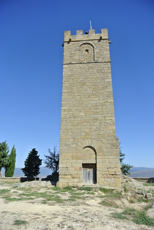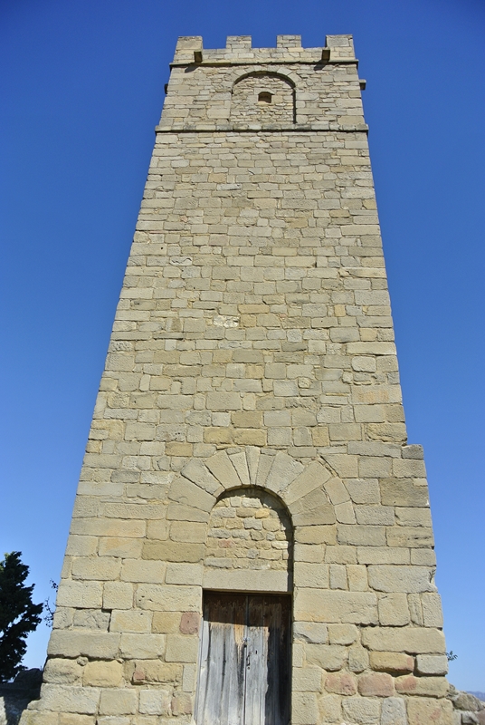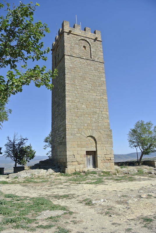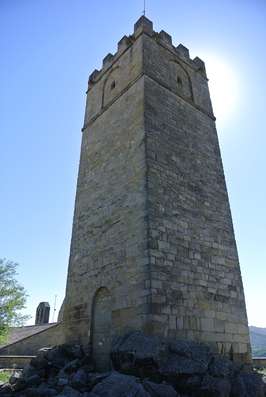 En el centro se yergue la esbelta torre, de planta cuadrada (6 metros de lado), obra de sillería y remate almenado, restaurado con acierto. La puerta de ingreso se abre en la cara que da al patio y consiste en un arco de medio punto adovelado.