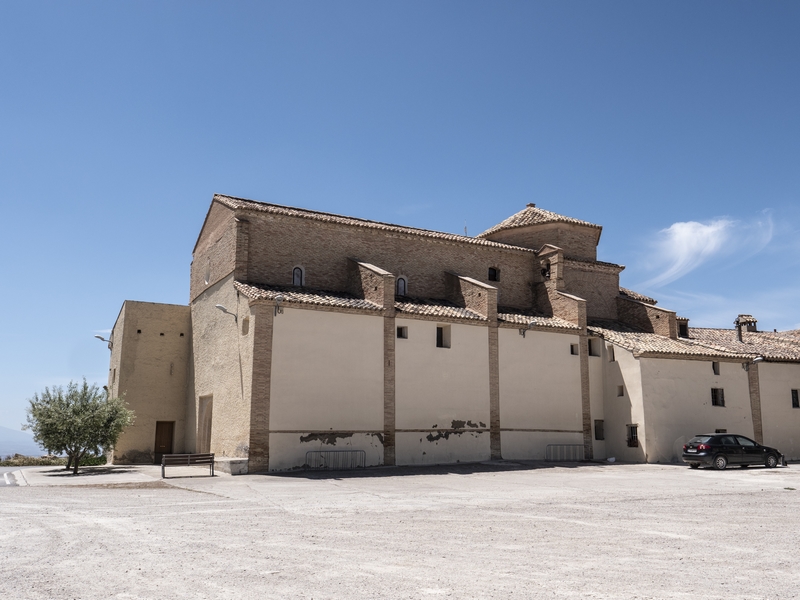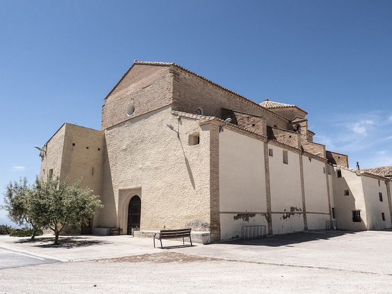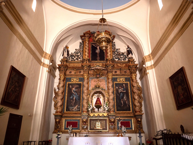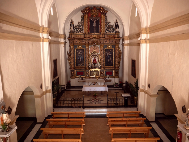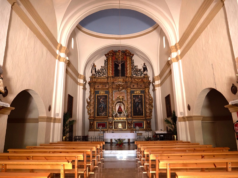 Entre ellas se abren arcos de medio punto que dan paso a un cuerpo de capillas, comunicadas entre sí, que se cubren con bóveda de lunetos de eje transversal al de la nave. Éste se prolonga un tramo más, que corresponde al presbiterio y está cubierto con cúpula ciega sobre pechinas.