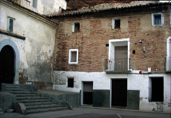 La fachada principal, recayente en la plaza Mayor, consta de tres alturas construidas con ladrillo. La subdivisión a que ha sido sometido ha supuesto la desaparición de la portada original, en la segunda planta hay dos huecos con balcón y a sus lados otros de ventana, todos ellos recercados de enjalbegado y en dinteles de sardinel. En el último nivel aparece, cegada y muy transformada, una galería de arcos de medio punto, bajo el alero de yeso con forma de escocia.