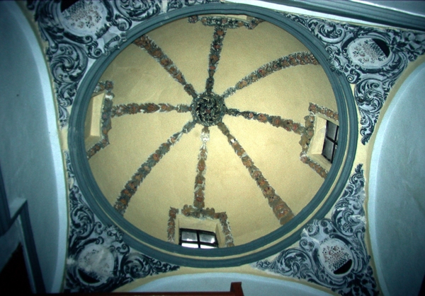 La sencilla puerta rectangular da acceso al "patio" o zaguán que conserva parte del enmorrillado original y comunica con la escalera, que se cubre con un bello lucernario barroco compuesto por una cúpula sobre pechinas. En el exterior la cúpula se trasdosa mediante un cimborrio octogonal de ladrillo rematado con una cubierta piramidal.
