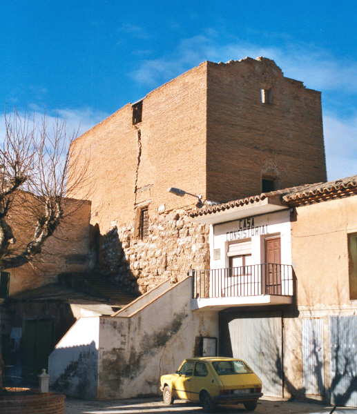 Datado entre los años 1350-1360, se trata de una torre de grandes dimensiones y potente altura de planta rectangular que contó con cuatro plantas, de las que se han conservado las dos inferiores y el arranque de la tercera. Sobre la planta baja, realizada con sillares de piedra de yeso y posiblemente destinada a albergar las bodegas, se encontrarían las tres plantas superiores, realizadas con gruesos muros de ladrillo y cubiertas con techos planos apeados sobre arcos diafragma apuntados. En el lado sur se dispuso la entrada elevada en arco apuntado que da paso a la planta noble, en la que se ha conservado una ventana en arco apuntado, situada en su lado oriental, en la que aún son visibles los restos de tracerías de yeso caladas formadas por arcos mixtilíneos entrecruzados. El torreón tendría sobre la última planta cuatro matacanes de ángulo, uno por cada lado de la torre, más un quinto matacán sobre la puerta de ingreso. La torre se cerraría con tejado a doble vertiente en los lados largos y a piñón sobre los cortos.
