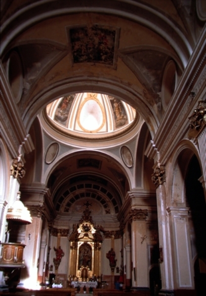 La nave y los brazos del crucero se cubren con bóvedas de cañón con lunetos que apean en pilastras de orden compuesto unidas por un entablamento muy prominente, mientras que las capillas lo hacen con medio cañón dispuesto transversalmente a la nave.